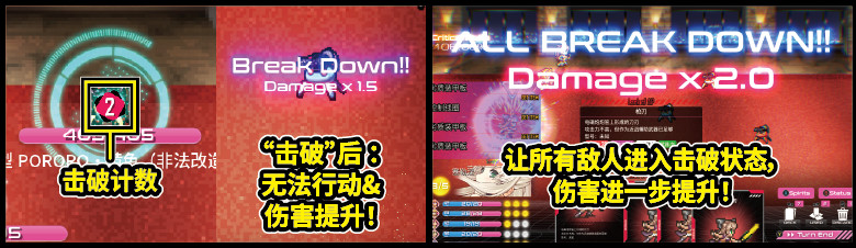 当你削减敌人的“击破计数”并让其进入“击破”状态时,敌人会无法行动,而且我方造成的伤害会提升!