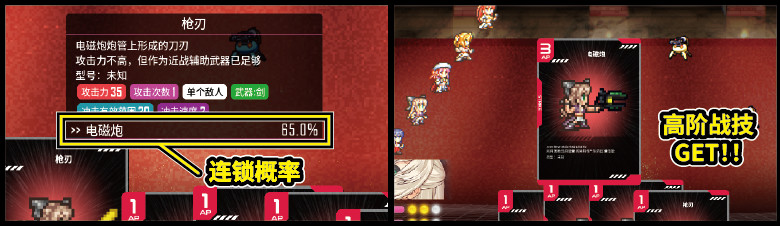 使用带有 “连锁概率(%)” 的战技时,有一定概率会触发“连锁”,并获得更高阶的战技!